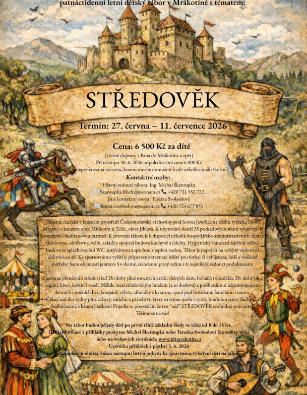 Zkuste se přenést do středověku! Do doby plné mocných králů, silných dam, boháčů i chudáků. Do doby plné napětí, bitev, hostin i veselí. Někde mezi středověkým hradem (a to doslova) a podhradím si užijeme spoustu denních i nočních her, koupání, výlety, táboráky s kytarou, spaní pod hvězdami, letní kino a saunu. Čekají nás dva týdny plné zábavy, smíchu a přátelství, které strávíme spolu s rytíři, hradními pány, šlechtičnami, s katem i šaškem! Přijďte se přesvědčit, že ten "náš" STŘEDOVĚK rozhodně stojí za to! Těšíme se na vás!